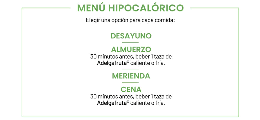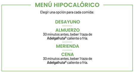 Como guía para una alimentación saludable se sugiere el plan hipocalórico Adelgafruta® que ofrece variadas opciones de menú para elegir durante 10 días. De ser necesario repetirlo, es aconsejable realizarlo dos veces consecutivas y descansar una semana antes de reiniciarlo.